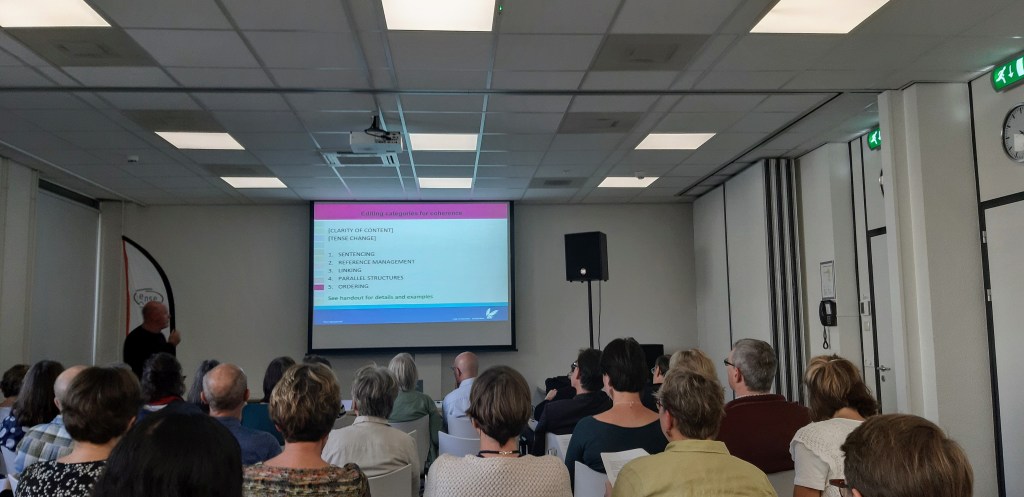 The PDD ended with a lecture by Vrije Universiteit emeritus professor of English language and linguistics Dr. Mike Hannay on flow, rhythm, and balance in writing. The key to writing that flows is variation. Good writing is attractive, clear and coherent, genre-faithful, and accurate. He listed a number of academic sources that have looked at what makes good writing, including information on prosody, the study of rhythm, meter, and intonation in poetry. Editors can use this knowledge to spot writing problems in the work they edit. Hannay’s handout provided us with many examples of these problems, and it was great fun working through them with a room full of language professionals.