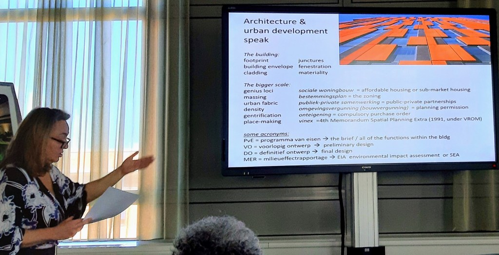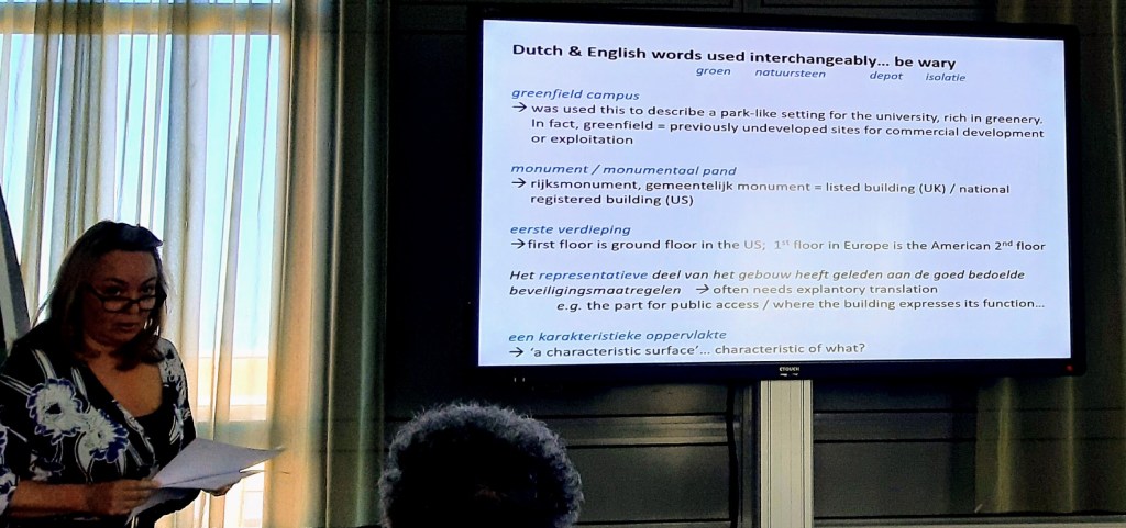 Next, I attended a fascinating presentation by Dianna Beaufort on writing and translating in architecture and urban planning. I have a background in urban studies and am familiar with the embellished writing architects can produce. Beaufort guided us through some examples of problems caused by “architecture and urban development speak” or false friends and showed us how she dealt with these. Translating “een karakteristieke oppervlakte” into “a characteristic surface,” for example, does not work!