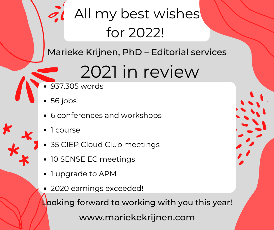 In 2022, I plan to attend fewer online events. I’m involved in the organization of the CIEP’s 2022 conference, which is planned as a hybrid event. I hope the pandemic subsides enough for us to be able to continue organizing the in-person part of this annual conference! I also plan to go back to basics in terms of courses, starting with the CIEP’s Copyediting 2: Headway course. I will continue as SENSE’s Social Media Coordinator. I may work with a designer to create a logo for my business. And I hope to take plenty of exciting trips by train!